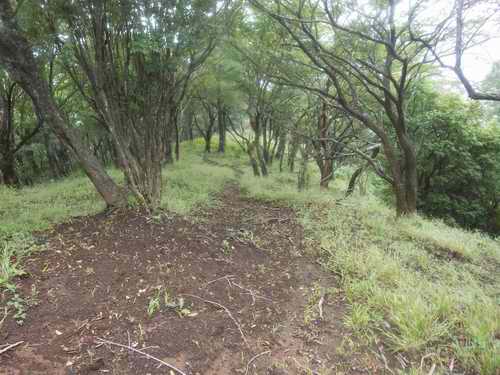 1150m付近から上部は草地と遠くの視界を制限する程度の密度に立木が生える。時々、草が濃くなる平たい尾根では踏み跡がばらけて足元が不確かになるが、なすがままに歩いていけば再び踏み跡に出る。古い赤テープ、黄色いリボン、それにくどいほどの紫スズランテープ。