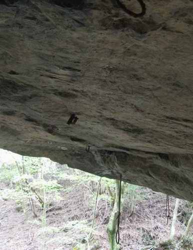 その大岩のハングの庇の下にだらしなくぶら下がる二本の捨て縄は退色して全くの白に見えるが、本来はブルーの捨て縄だったのだ。30年くらい前の事だが、そのときの事はいまでも良く覚えている。岩の基部から眺めるボルト二本には赤さびが浮いて出ている。それに今ぶら下がるとその瞬間に「ブチッ」と切れてしまうのではないだろうかと見えるが、打った当時はかなりのショックにも耐えたのだ。確かハーケンが一本抜けてぶら下がったことがあるけど大丈夫だった。その亀裂に打たれたハーケンも既に土色をなしていて、そのうちに岩と一体化して消失していくだろう。