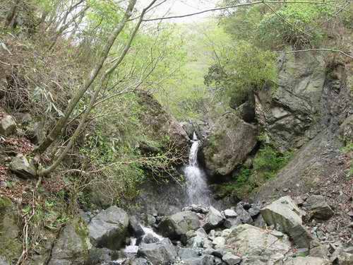 落口付近の岩が多少とも硬いようなので、滝の状態をなんとか保っているが、その岩の下は掴めば崩れるようにも見えるボロボロの岩で固められている。砂糖をお湯で溶いて固めたカルメラのような状態にも見えるから、数十年に一回くらいの大雨でも降った際に落口の一角が崩れたら滝のすべてが一気に崩落して無くなってしまうような感じがする。