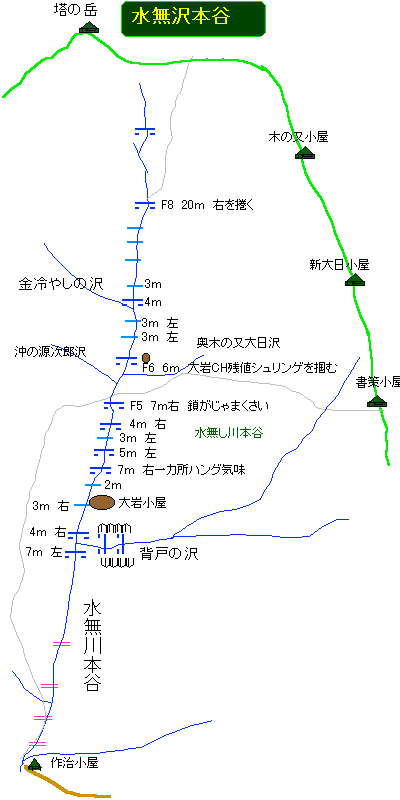 自宅4:30〜山岳SC6:00〜戸沢出会6:40〜水無川本谷F1 7:05〜F8〜右の小尾根〜稜線8:30〜塔ヶ岳8:40〜表尾根〜書策小屋〜書策林道〜戸沢出会9:30〜山岳SC10:00〜17:00〜自宅18:20 2001/07/20 晴(中腹には霧ガスが漂う)
