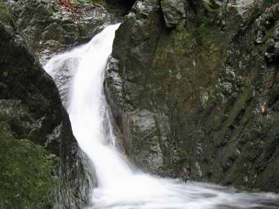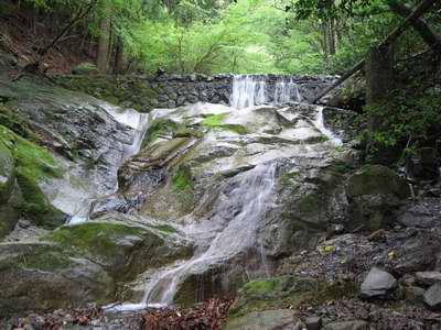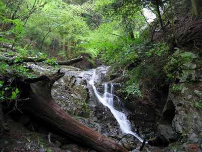 まず目に入ってきたのは倒れた杉の古木だ。倒れたのは数年前と言うことはないだろうけど枝がもげずに付いているのだから八十余年前という古さでは無いだろう。だが幹回りは五m(直径でも1mは優に越えるので樹齢数百年?かなあ)に達しようという古木が、一本ズズ〜ンと上から下に一直線に倒れているのだった。その木と直角に交わる形で、別の一本が左手の斜面から倒れている。これも径1mに達しようという古木である。滝は、その二本の古木が倒れて交じり合った下から始まり、上の幟はためく登山道にかかる橋まで延びているのだ。