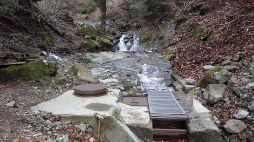 その岩床を枡形に掘り、上を丈夫な網で囲い、流れてきた水を一括全量を取り込む口に取水口となっている。