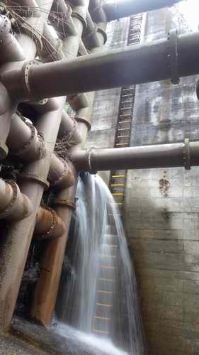 この施設、鉄パイプ部は現時点で床面から高さ8m程までが埋まっていて、右端の上から水が滝のように落ちている。