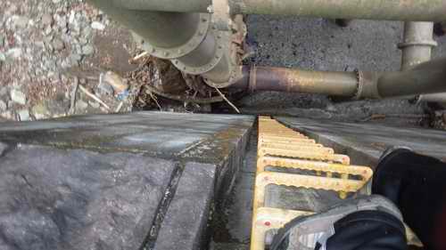 それで鉄パイプを支えている堰堤開口部下から上までをつなぐステップを登ることにした。
