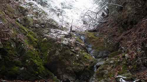 自宅6:00〜本厚木6:23〜伊勢原バスで6:35〜大山バス停7:00〜雲井橋7:10〜浄水場施設〜大堰堤上7:35〜二重滝社着8:40〜下社8:45_55〜見晴台〜山頂9:55〜北尾根〜ネクタイ尾根入り口10:10〜ネクタイ尾根もどき下降〜石尊沢支流に下降10:50〜その左岸尾根に〜唐沢峠下〜唐沢峠11:05〜不動尻11:30〜不動の滝を見てから〜煤ヶ谷12:50_13:08清流の館で一休みしてバス〜千頭橋13:30〜自宅13:45 2016/03/12曇り