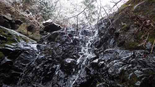 雪の乗る岩床の沢は、二重滝から角度を増してきて、今日のコンデションでは俺には難しすぎて登れない。