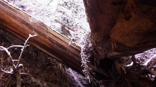 倒木二本が重なる真下は滝壺になっている。