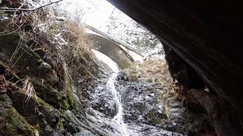 2m横に移動するとアーチ下の岩床に乗って二重滝の下に着く。
