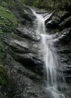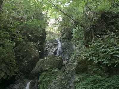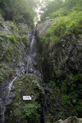 暗い谷間に3m程の小滝を前衛として、中段に左右の大岩が門柱の様に立ち、奥に8m程のスラブの滝が仁王様の様に立ちはだかる。