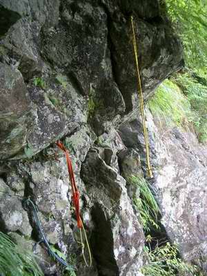マシラにとっては、これくらい(3級?)がロープ無しで登れる限界だ。結構やばい。左側から右に寄るように、この間も腐るほどある残置の捨て縄には触らないように登る。