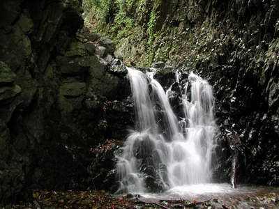 橋の手前から沢に降り、橋の下をくぐって20m進むと周囲が狭くなり、3mの滝となる。足慣らしには手頃な滝の左側から登る。7mの見た目は立った滝に続く。滝に圧倒され、右側の簡単な岩尾根に逃げようかとしたが、せっかくの滝である。左側の凹溝に取りつき、上部は水流左のフェースに移って登る。岩がしっかりしているので見た目よりは簡単だと思う。いくらも間をあけずに次は6m+3mの滝(別々にFナンバーが設定されているが一連の滝だろう)の下部滝は左のフェースが、ホールド・スタンスともにがっちりしていてマシラの力量にはちょうど手頃で、しごく快適な登りが楽しめる。