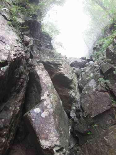 それからここは何人が歩いたのだろうか。百人くらいが歩いたなら、この堆積物の中で不安定だったのは少しのショックを与えるだけで落下して行くはずで、残された石はそれなりに安定してくるだろう。それがそうではないということは、今年新たに新茅の沢に入った人の多くはここら、あるいは先ほどの浸みだし水のあたりから右手に入って登山道に出て行ったのだろう。