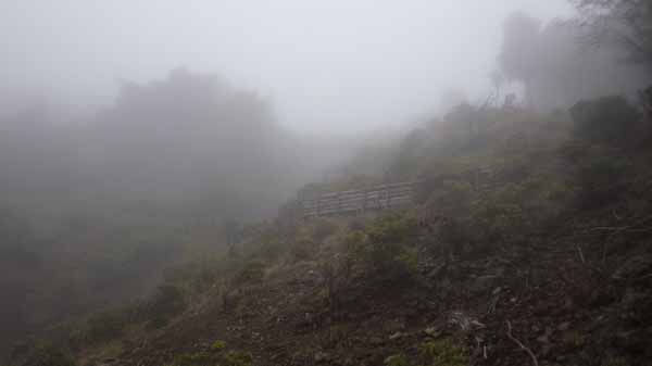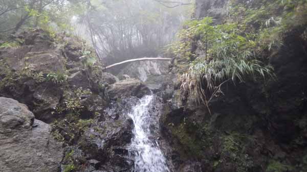 という程度の滝が幾つか続いて、周囲の岩から水の染み出す滝の上で水が無くなり、代わりにあたりを霧が漂う。