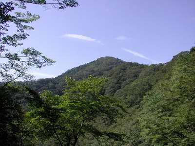 そこから下草の這える気分の良い樹林帯を10分ほど歩けばベンチでは登山者が休憩中の1145mのピークにつく。その彼を追って檜岳に行く。遠くに水気にかすむ遠くに青い富士山が全くの夏を思い出すように白い雲とともに空中に浮かぶ。