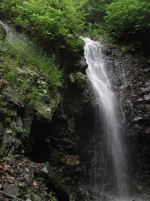左俣に戻り、ゴロ石、曲がりくねった沢を進むと7m程の滝に突き当たる。