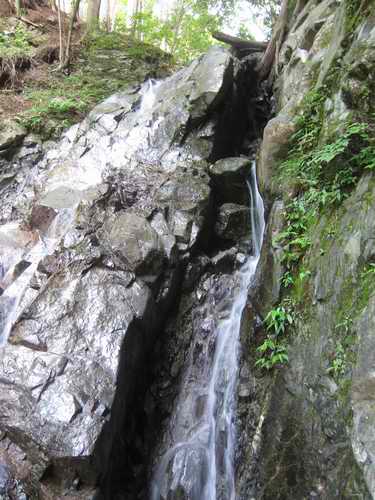 最初の滝はヌルヌルな感じのスラブの滝であり、全般的に岩が逆層のように見えていて巻いてしまいたくなるが、右端は凹状溝になって二段に別れて、凹の中及び側面が登れるような感じに思える。落ち口の被るCSと倒木が気になるが、溝部半ばに引っかかっているCSが足がかりになるはずで、そこから左に移つって中央の落ち口に出られるだろう。