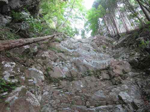 カラカラに涸れた岩の沢がここから奥に続く。簡単な岩場状がいくつか続いて、それのドン詰まりのような感じで高い涸棚が見える。