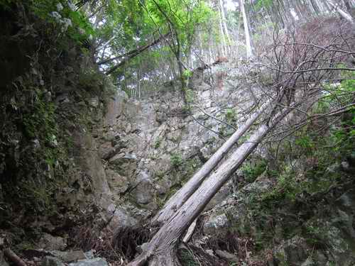 それ用らしい虎ロープが先ほどの滝の登り口岩の右に上から垂れて降りてきている。でもそことても素直には登れないと思う。ロープ筋に従って登るとしたら垂直な露岩帯を3mはロープ登攀させられるのだ。おまけにロープには握り瘤が付いていないので登り切る前に腕力が尽きてしまう可能性が高い。脆そうな岩の上で腕力登攀するのは好みではないしねえ。
