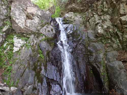 直ぐに垂直5m程の落ち口の岩が水流を二つに分けている滝に続いていて、こちらは他に登りようがなく、素直に右側を巻く。