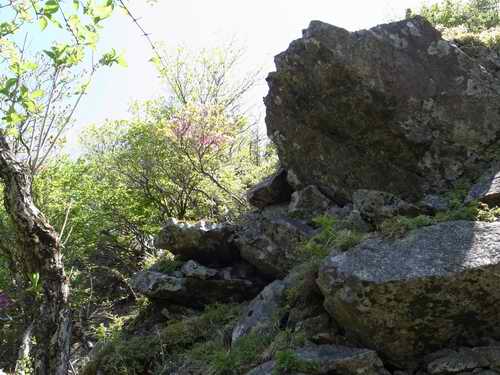 不安定そうに積み重なる露岩が頭上に覆い被さるが、左から岩に偏荷重をかけないように避け登る。そこらの岩の脇には野の花が鼻つら高さの位置に咲く。