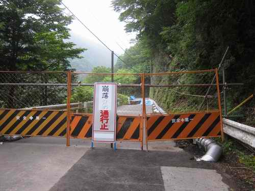 唐沢キャンプ場を過ぎて市ノ瀬キャンプ場を過ぎたところがその場所だった。道路全幅が眼下50m下の中津川河原迄垂直にスポッと綺麗に抜け落ちていた。