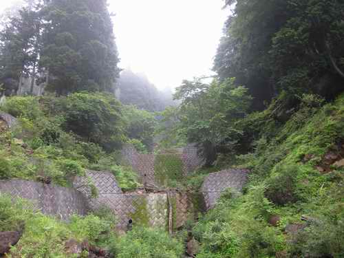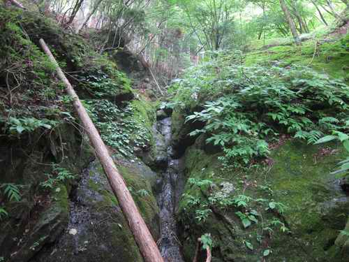 地獄沢橋の脇から山に向かって林業道路が延びている。入り口は柵でとじられている。そこに自転車を止めて林業道路にしては高規格かなと思える舗装道路を歩きだす。最初のカーブの角にモノレール小屋があり、方向を変えた道は沢沿いに延びていく。緩やかに上に登っていく林の中のスギと檜の木はどれをとっても幹回りは2m位ある成木となっていて、一般住宅用にするならば手を入れ過ぎているように見える美林だ。道は地獄沢を右から左に水干橋で横断して、次の大杉橋で渡り直す。ココからミズヒ沢の歩きが始まる。