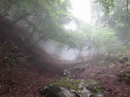 その登りに掛かる時間は実際には僅か20分なのに、足場だってそんなに悪くはなかったのに、「次はあの岩まで」 30歩ほど進めば着きそうな一時の目標を設定して、着いたら一息入れて休み、また次のを仮設定して、それを繰り返す。この場合の目標となる物って、ちっちゃな石、ちょっとした地面の出っばり、朽ちた倒木の端、細い立木等々、そんな些細なものだ。