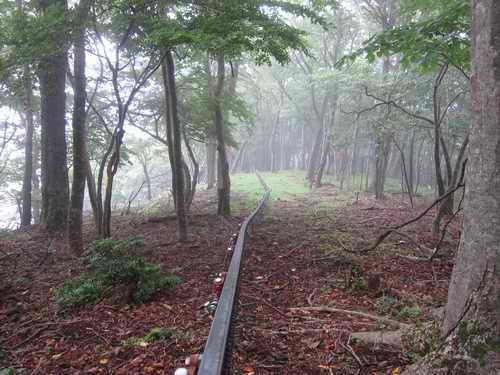 自宅5:00〜宮ヶ瀬三叉路(県道70号通行不可御触れあり)6:00〜市ノ瀬キャンプ場先で道路全面崩落6:15〜地獄沢橋(自転車デポ)6:55〜水干橋・大杉橋7:10〜ミズヒ沢〜稜線8:05〜ミズヒの頭8:10〜西沢の頭8:20〜地獄沢左岸尾根(モノレール軌道沿い)に入る8:40〜新多摩線14号鉄塔9:00〜地獄沢橋9:15〜布川橋(唐沢林道)9:30〜丸淵9:30_40〜物見峠10:00〜自宅10:40 20130720 曇り&霧