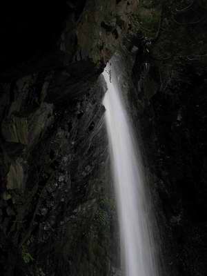 大滝は正面からは垂直の滝に見えるが、滝壺横に立つと、水は宙に放物線を描いて真っ直ぐ落ちることから垂直を越した滝であることが直ぐに分かる。