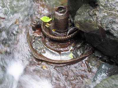 最初の丸太の堰を回り込み8m滝まで50mの位置まで進むと、流れの中にエンジン一機が大半流れゴーロの中に埋め込まれた状態で横たわっている。