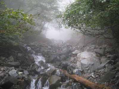 そこまで行けば、キューハ沢の残りはガラガラの岩の間に水が流れるゴーロの沢だ。周囲に霧がかかる。山の上は雲の中にあるらしい。