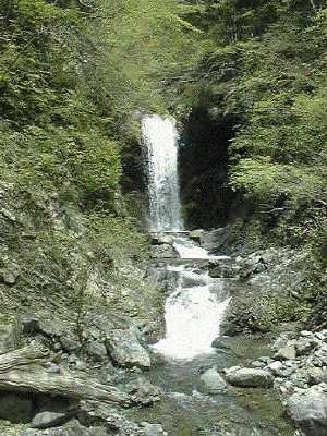 本流には奥に大棚が水煙にかすんでみえる。4町4反を渡ると薄暗い大棚から爆風のような風が押し寄せてくる。