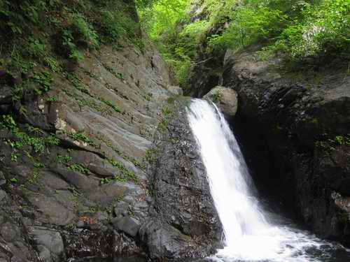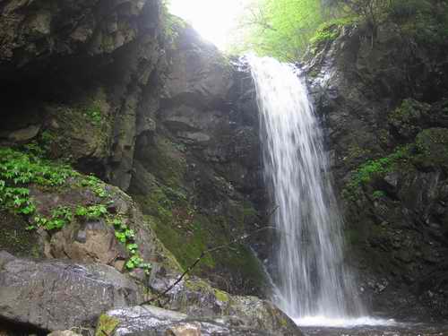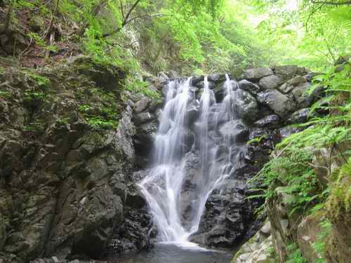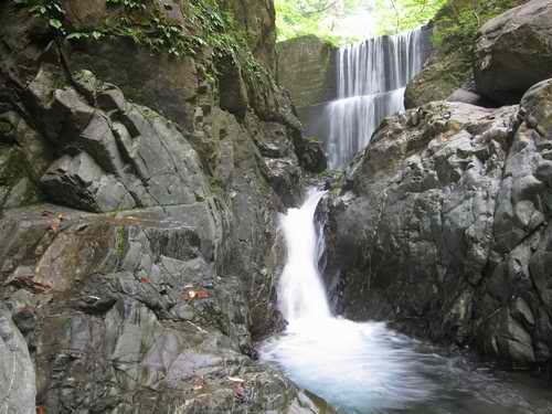その滝、確かに岩は黒いが、開けた場所に光を受けてキリッと立って黒々と光る一枚の岩で出来た滝は、堂々としていて、オバケというよりは、明るいおばさん風なと言い直すだろう。