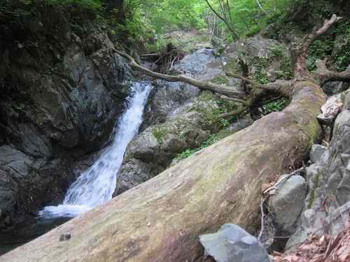 三個目の滝は倒木を橋代わりにして登る。上に続けて見えるのがオバケの滝だ。