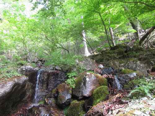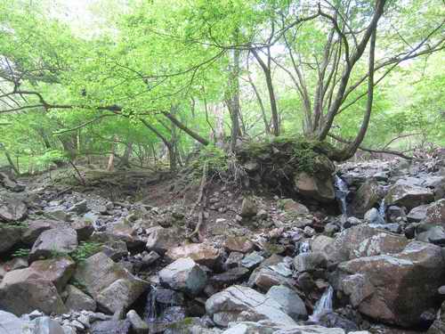 そこからの沢は岩場のような所もあるが、岩は乾きフリクションが良いから奥に進んでいくのはとても簡単だ。そして水量が減ってきて転がっている石が幾らか小振りとなる。石は安定していて歩きにくいということは無い。ブナの木の根元から数m離れたところで水がしみ出して、そこから上では水流が無くなる。
