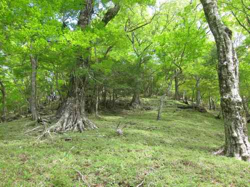 その小尾根は前回(昨年)歩いたのと同じ尾根(三角の頭に直接至る)のような気もするが、それよりも一つ左の尾根であったかも知れない(帰宅後確認すると日高P1461mに直接乗り込む尾根であった)。太いブナの木とモミの古木がまばらに混じって立ち、葉を通過して差し込む光に膝下の高さの下草が青々としている。歩行を妨げる笹や藪は一切無く、草を踏み緩い傾斜の広い原を足の向くままに登っていく。登るに従って雲が薄くなり、上空から日が刺してきて、今までの雲だと思っていたのが谷間に溜まったきりだったのだと知る。そんな霧の合間に見える三角の頭が本来は正面に見えるはずなのに、右に見えているのは登っている方向が思っているのと違うからなのだ。そしたら踏んでいる今場所はどこなのだろう。そんなのどうでもいいか。たいして違うところに行くはずもないのだもの。