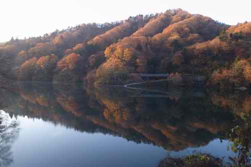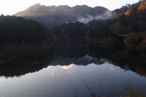 土山峠からは湖面に写る紅葉を撮りつつ走る。写真撮る時間分だけは家を早く出てきた。土山峠の東側から差し込む光が白い束となって宮ヶ瀬尾根から下がって湖面に入り込む。あるいは山襞の稜の高い位置に当たる。そこらの木々だけ色づきが映える。光が少しだけ外れただけで黒い影となって縞模様となる。コントラストがちょっと強い。