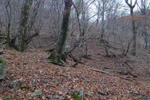 日が当たっていたら尚気分のゆったりする林なのであろうに。そんな林の木の下には昔に径路だったような踏み跡が真っ直ぐ伸びて、幾筋かに分かれた沢の末裔の窪を横断していく。