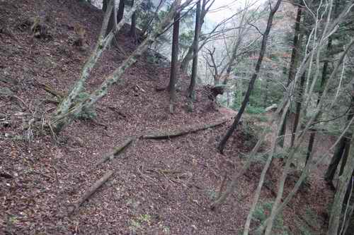 そうすると杉の木の下に径路は更にはっきりしてくる。幾らか崩れかかっている箇所もないわけではないが、概ねしっかりと道形が残っている。助かるのは踏み面は軟らかく固められていることだ。膝に軟らかいのは良いが、落とし穴の罠のように下の土が流れ底が抜けるような軟らさでは歩きにくくて困る。