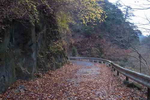 瀬戸橋の少し奥で丸太の吊り出しがされていることもあり、ここらまでは車の出入りは多そうに見えたが、崩落場所から奥は当然ながら轍は着いておらず、路面は枯葉で一杯だ。先週パンクしたばかりなので、枯葉の中に小石が潜んではいまいか、乗り上げてもショックが来ないようにゆっくり走る。