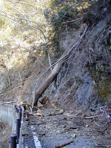 キューハ沢の手前、頭上から朽ちて落ちてきた根回し1.5m以上の一本の大木が道路を横断しているのをくぐって通過する。
