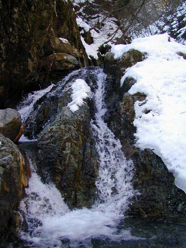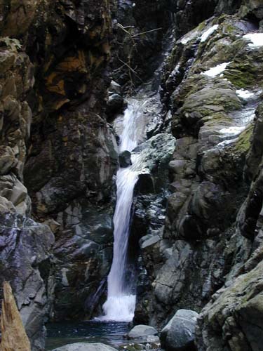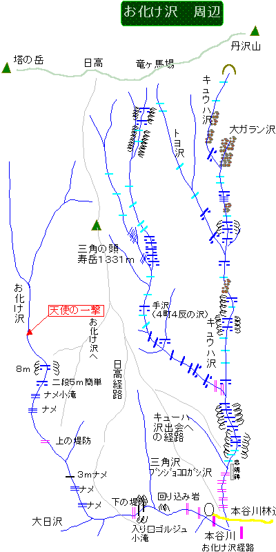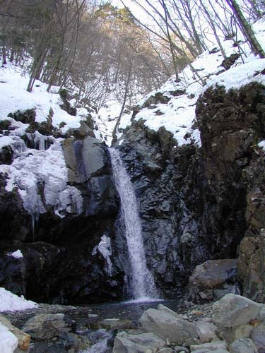 自宅6:40〜本谷川林道終点(キューハ沢出会いから50m)8:30〜三角沢出会い〜大日沢出会い〜上の堤防〜8m大滝10:00〜そこから少し行ったところで腰痛勃発〜下降開始10:30〜出会い14:15〜自宅16:15 2002/2/9朝方は快晴昼頃から山には雲が広がり家につく頃雨がバラバラでもその後また晴れた日
