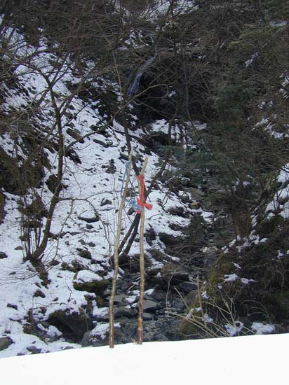 大滝を巻いて降りる雪面の前に手頃な枯れ枝を拾って二本ストックになる。