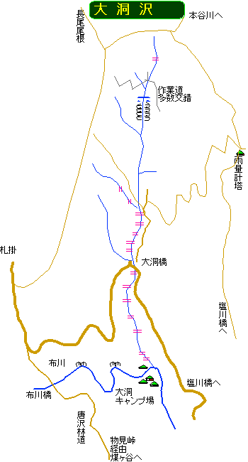 自宅6:20〜宮ヶ瀬山彦大橋7:20〜大洞橋〜唐沢林道入口8:00〜布川橋(下降)〜大洞キャンプ場(廃屋状態)8:20〜大洞沢〜大洞橋8:45〜大洞沢唯一の6m滝9:05_9:10〜登山道9:30 すこしの時間右に行ったり左に行ったり 直に三分岐に行けば二分以内である〜札掛/キューハ/塩水の三分岐9:35〜雨量計9:45〜大洞橋10:00〜唐沢林道入り口10:10〜布川橋10:15〜自宅11:30 20060924 抜けるように空が青く透明な一日でした。