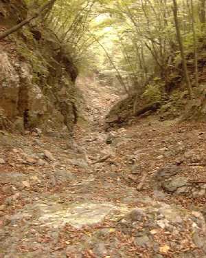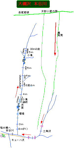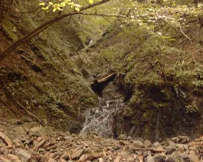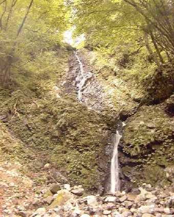 この少し上にF2(3mほどの棚)がかかり、左から上がり、石作りの小さな砂防ダムを越すと、流れの先は小滝が連続していて(2,2,2,2,1,2m位)適当に遡行する。