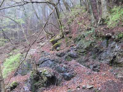 水は既に尽き、砕けて転がる石とその上に堆積する枯れ葉の上を、詰めの露出した岩肌に達するまでは、淡々と歩くことになる。
