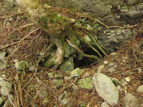 そうすると、最奥の手前5mの所にあるφ30cm程のブナの木の根本に、小さな空間があるのが見える。