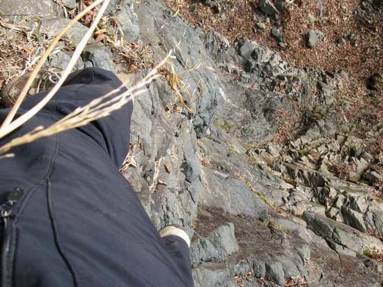 登りだして3mの位置と、それから先の途中に二本のランニング用ハーケンが打たれていた。古いけど、乾いた岩棚に打たれているので、まだまだしっかりしている。しかし、そんなのパートナーがいる場合にのみ用をなすのだ。マシラには無用。10m程登ったところで、下を見る。高度差にクラクラしそう。幸いホールドは純層で登るに困らない程にはある。とりあえず岩はそこまではしっかりしていた。難度は三級上から四級ってな感じ。調子が良いときなら快適快適、鼻歌の一つも出ようかとでも言いたいほどなんだけど、実際はホールドが何時なんどき剥離するかという考えを捨てきれずギクシャクした登りで、こんな時は体は恐怖感に溢れていて「登らなければ良かった」って感じてる。これが最後の一枚かとデジカメを取り出して立っている所から下を三・四枚写す。