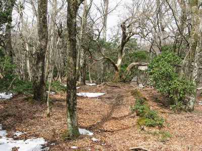 その道が右方向に水平に進み出すところで、直上して稜線に至る。それから稜線を僅かに残る雪を踏んで、いつもの静かな三角の頭に着く。