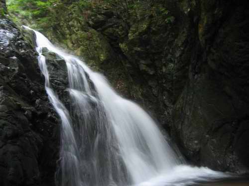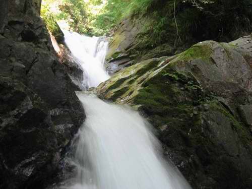 小滝はホールド豊富なので快適だ。 登って立つ落ち口は左右両岸は迫っていて間口1.5m程の狭さである。立つ位置は右岸の上だが、そこは船の舳先のような形状だから一端左岸に移って一歩進んでから右岸に再び戻るというのが通常の登り方となる。だが狭い落ち口に流れが集中するので、水量が多いときは左岸に移るための1mほどの流水がとても怖く感じる場合がある。
